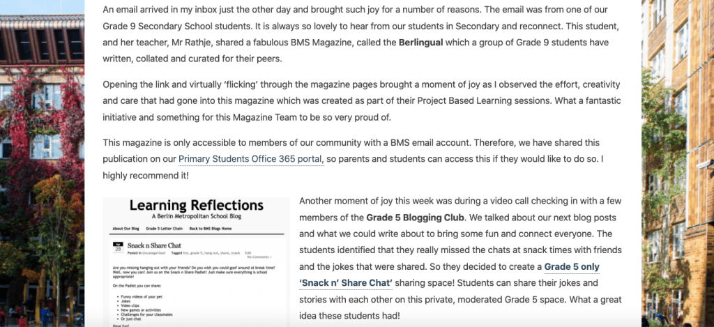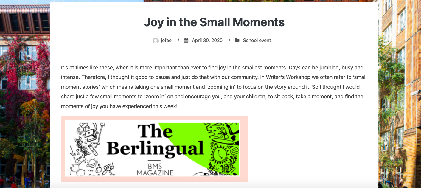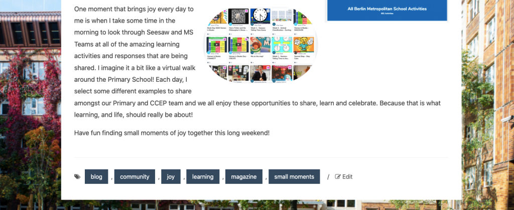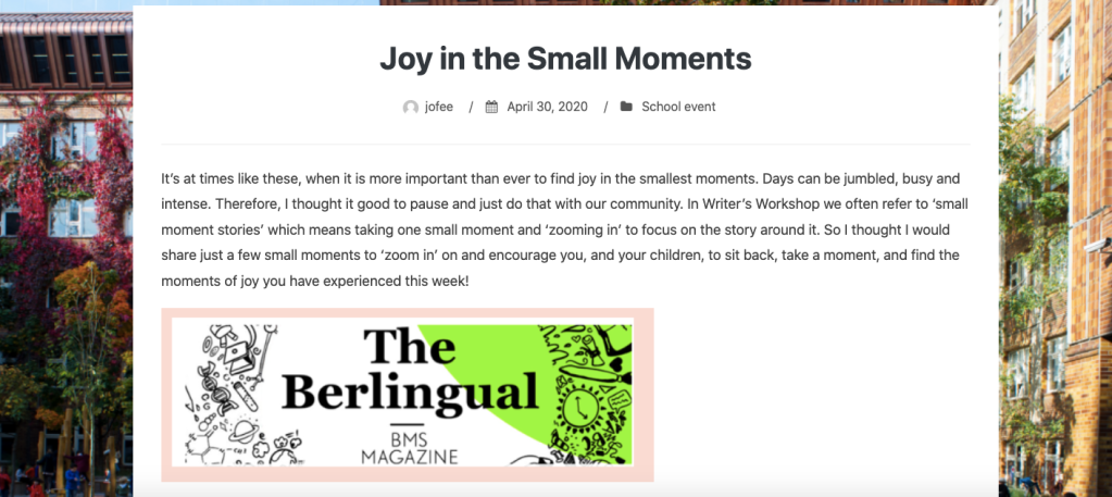 I recently shared a post with my school community about taking time each day/each week to find joy in the small moments that are scattered throughout our lives.