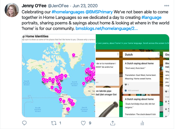 Finding space for individuality to be celebrated and to bring community together in an inclusive way is so important. During lockdown we could not run our Home Language Program as usual so we made this into a community event. We created an interactive map of where we feel at home for everyone to anonymously share, shared our languages through poems and sayings and students (and adults if they wanted!) created Language Portraits. This was all done virtually through a live stream assembly and recorded activities and video calls.